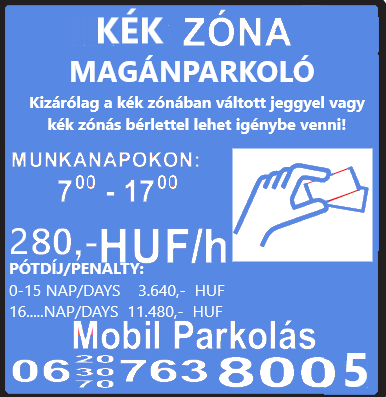 A parkolás kizárólag előre megváltott kék zónás jeggyel vagy kék zónás bérlettel vehető igénybe.