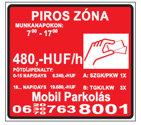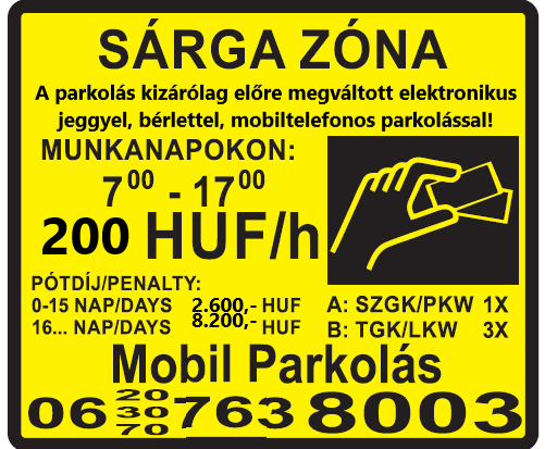 A parkolás kizárólag előre megváltott elektronikus jeggyel, bérlettel, mobiltelefonos parkolással érvényes.