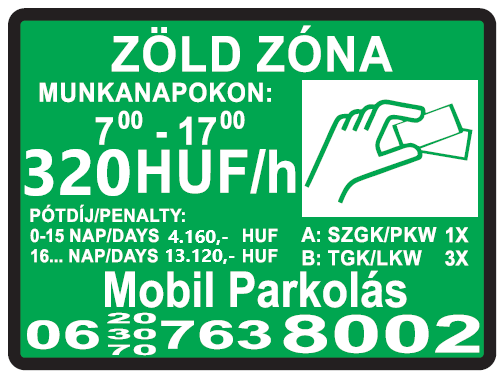Felhívjuk a zöld forgalmi rendszámmal rendelkező gépjárművek vezetőinek figyelmét, hogy a közterületi fizető parkolók piros zónáiban a parkolás díjköteles!